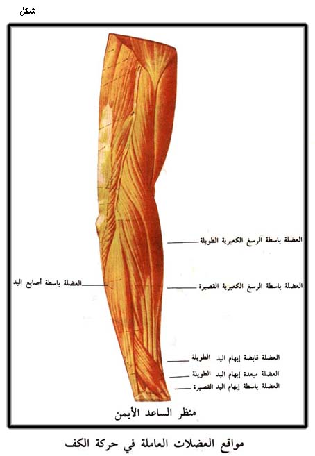 مواقع العضلات العاملة في حركة الكف (الساعد الأيمن)
