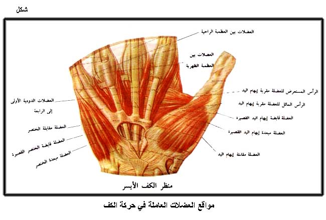 مواقع العضلات العاملة في حركة الكف (الكف الأيسر)