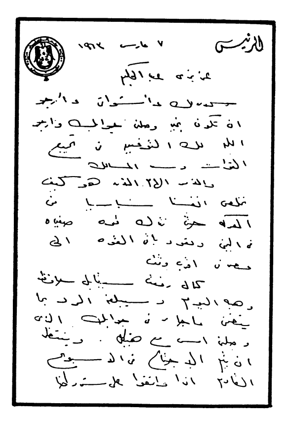 كمال رفعت سيقابل حافظ وهبة اليوم وسيبلغه الرد بما يتضمن ما جاء في جوابك الذي وصلني أمس مع هيكل. وينتظر أن يتم الاجتماع في الأسبوع القادم إذا وافقواعلى شروطنا بكمال رفعت وقد كان ردي أن الشيخ حافظ وهبة اتصل فعلاً مع علي خشبة وإذا كان هناك ما يود إبلاغه فليكن عن طريق علي خشبة وكان قد اتصل بعلي خشبة تليفونياً حدث هذا من 15 يوم تقريباً وتمت المقابلة مع علي خشبة أي بعد ثورة العراق بأسبوع. وقال في حديثه أن فيصل ضد الحرب ولكن سعود هو الذي يصمم على الحرب وأن أخوه فيصل يلحون على إيقاف القتال خصوصا بعد ثورة العراق. وقال إن استمرار المعارك سيستنزف موارد مصر والسعودية وأن الذي يستفيد من ذلك هو المستعمر.
