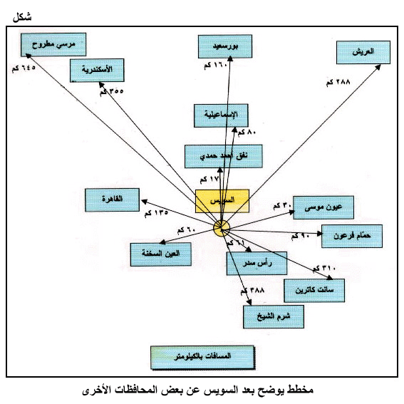 مخطط يوضح بعد السويس عن بعض المحافظات الأخرى