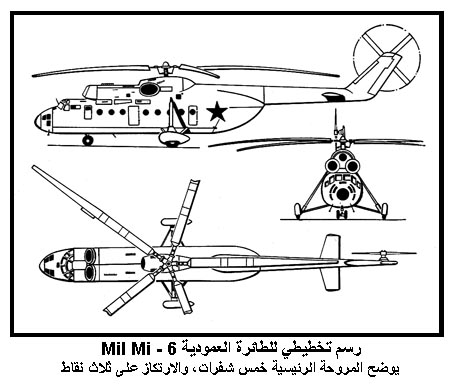 رسم تخطيطي للطائرة العمودية Mil Mi-6، يوضح المروحة الرئيسية خمس شفرات، والارتكاز على ثلاث نقاط