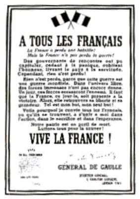 "إن الحرب لم تنته مطلقاً، لقد خسرت فرنسا معركة، ولكنها لم تخسر الحرب، فهي حرب عالمية، ومعركة فرنسا لم تكن سوى فصل صغير منها".