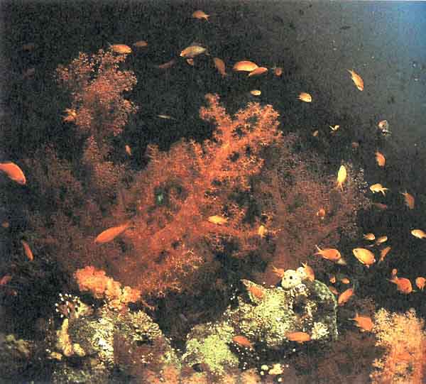 الشعب المرجانية: لاحظ ألوانها المختلفة وبأن الأسماك من حولها من ألوان مقاربة