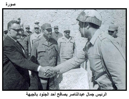 الرئيس جمال عبدالناصر يصافح أحد الجنود بالجبهة