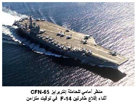 منظر أمامي للحاملة إنتربرايز CFN-65 أثناء إقلاع طائرتين F-14 في توقيت متزامن