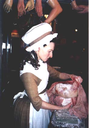 في متحف مدام توسو، صورة تمثال مدام توسو وهي تأخذ قناع الموت من رأس ماري انطوانيت المقطوعة Madame Tussaud shown taking a death mask from the severed head of Marie Antoinette