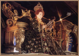 في متحف مدام توسو، صورة تمثال الملكة اليزابيث الأولى على العرش في بداية معرض روح لندنElizabeth I sits on her throne at the start of The Spirit of London