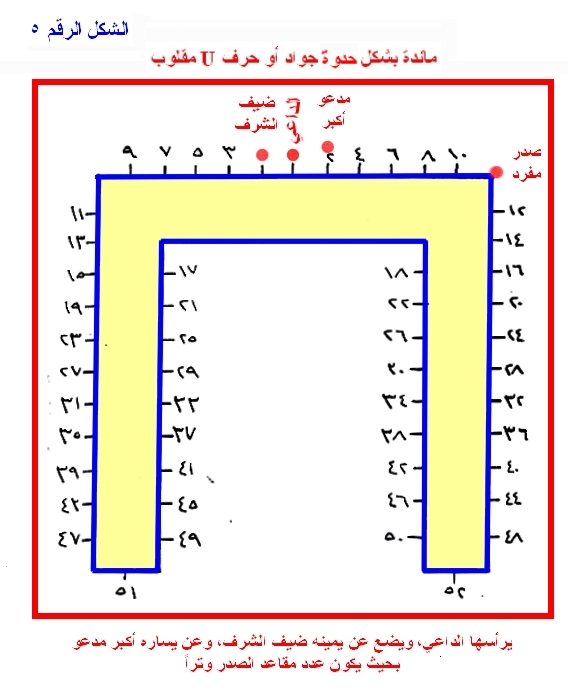 مائدة بشكل حافر جواد أو حرف U مقلوب، يرأسها الداعي وضيف الشرف وأكبر المدعوين