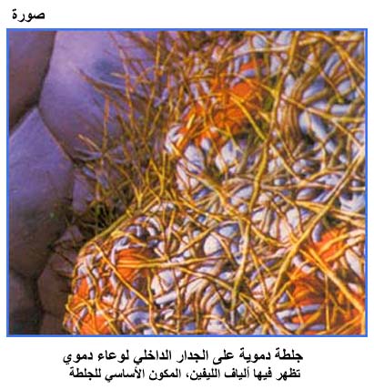 جلطة دموية على الجدار الداخلي لوعاء دموي، تظهر فيها ألياف الليفين، المكون الأساسي للجلطة