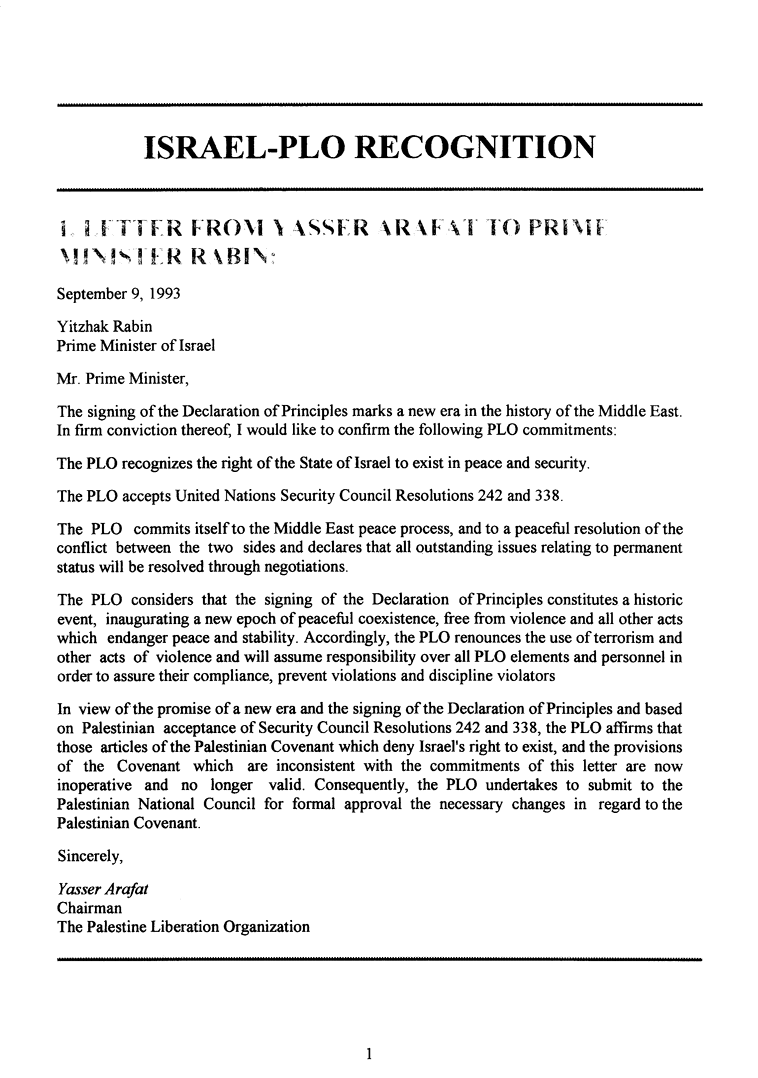 خطابات الاعتراف المتبادل بين منظمة التحرير الفلسطينية وإسرائيل