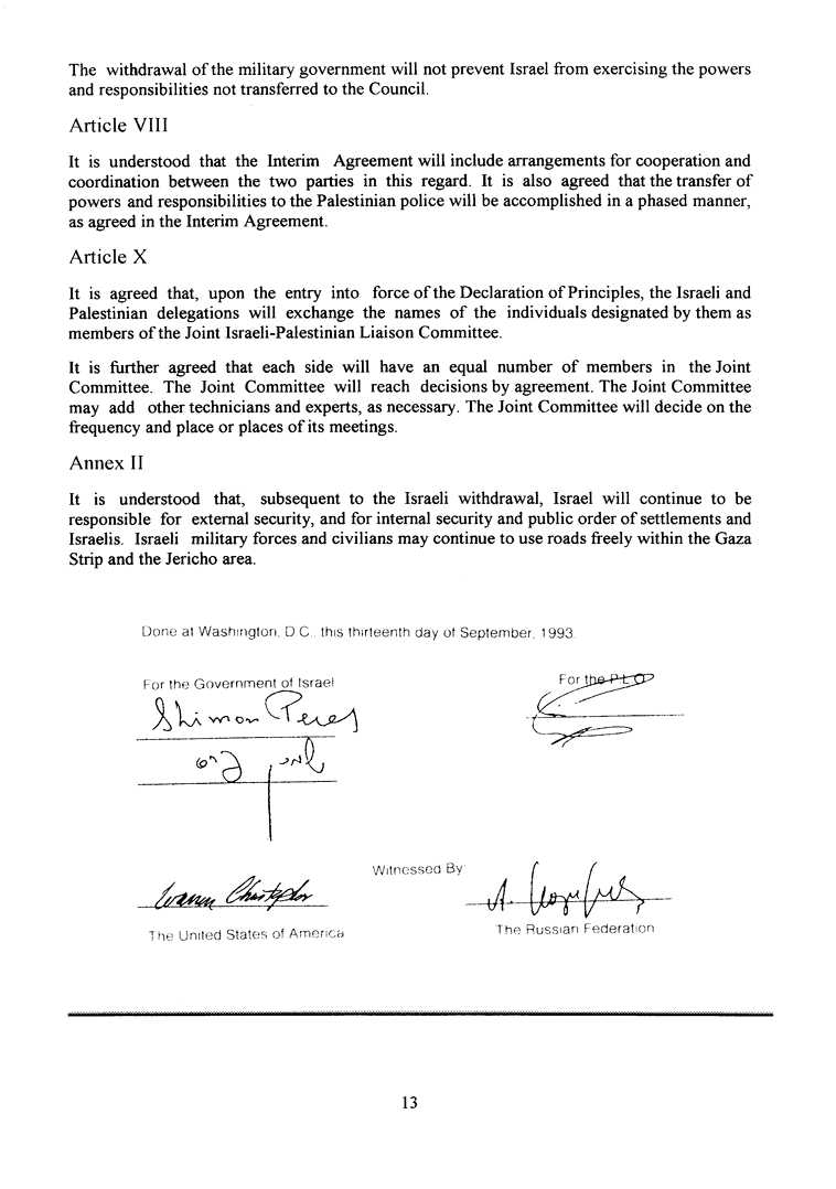 نص اتفاق إعلان المبادئ بين منظمة التحرير الفلسطينية وإسرائيل الذي عرف باتفاق "أسلو" أو اتفاق "غزة ـ أريحا للحكم الذاتي الفلسطيني تابع